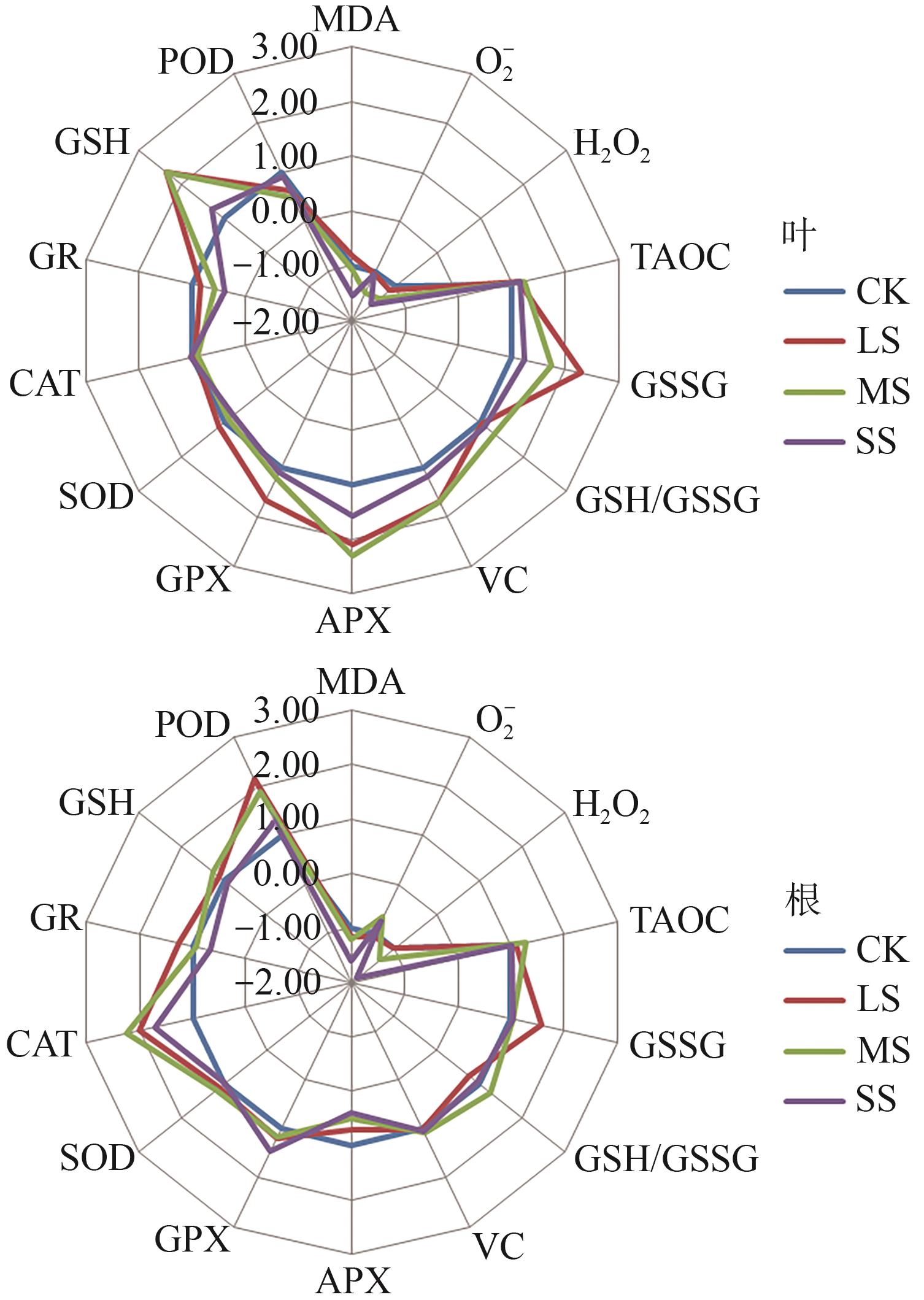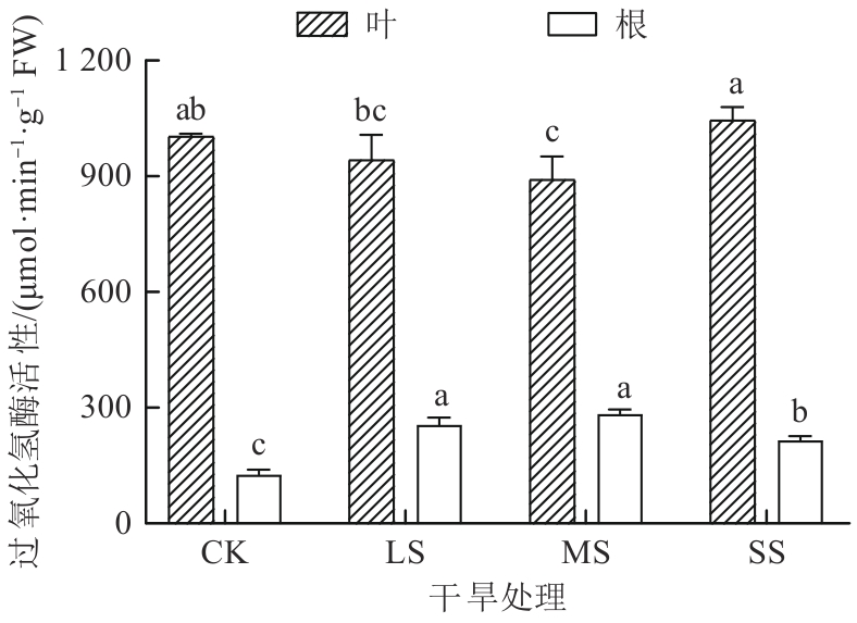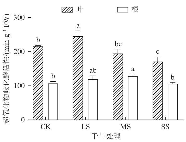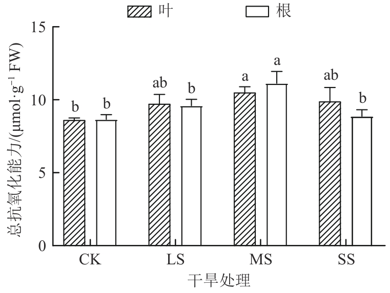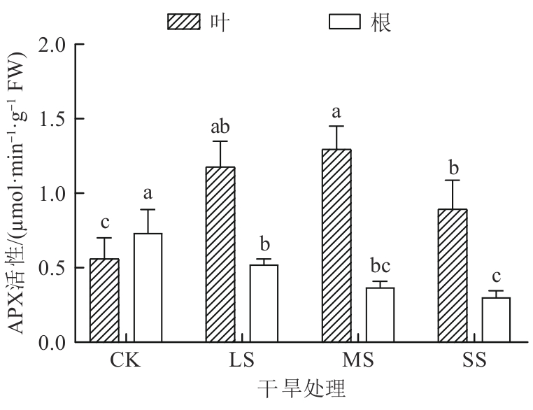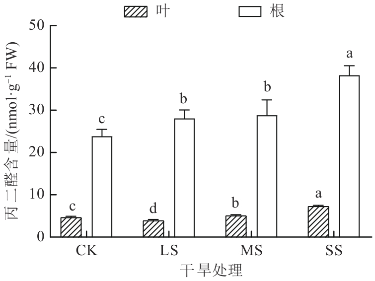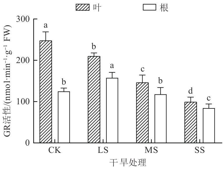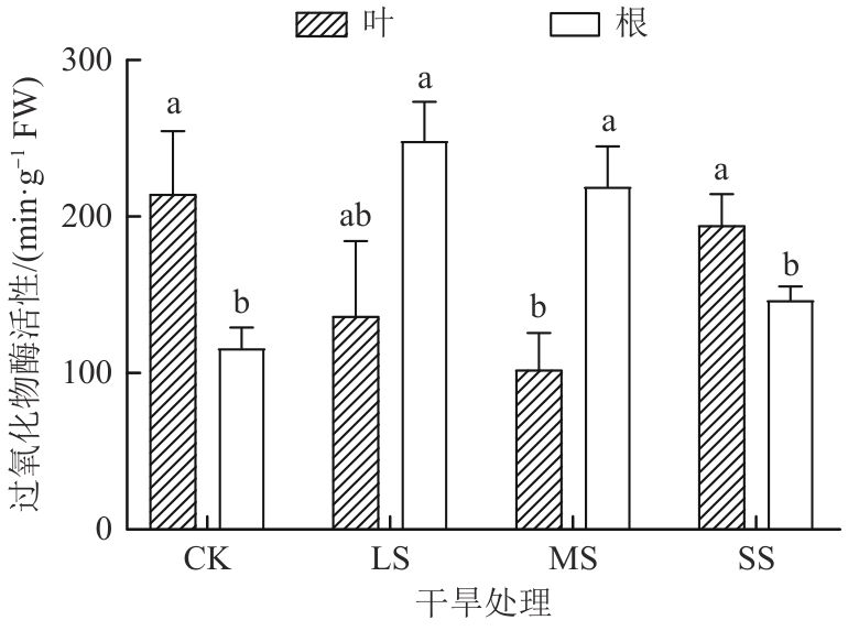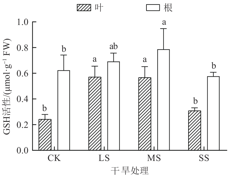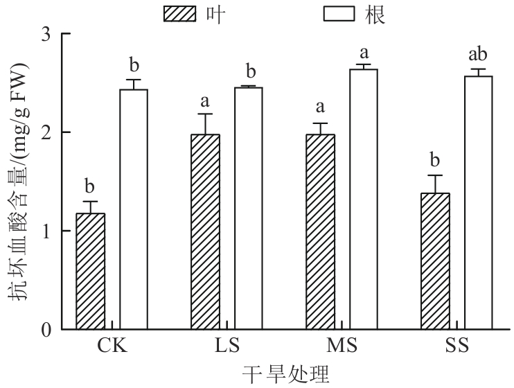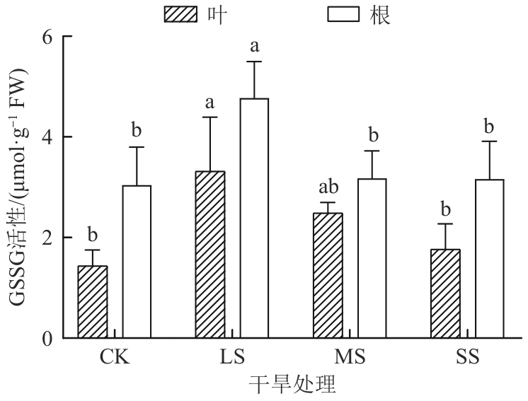 探究了干旱胁迫对药用植物乌拉尔甘草(Glycyrrhiza uralensis)幼苗生理特性的影响及抗旱适应机制。以一年生乌拉尔甘草苗为材料,采用盆栽控水模拟干旱胁迫,设置正常供水对照组(CK)、轻度干旱胁迫组(light stress,LS)、中度干旱胁迫组(moderate stress,MS)和重度干旱胁迫组(severe stress,SS),测定抗氧化系统及渗透调节物质等关键生理参数。结果发现,随着干旱胁迫程度的加剧,甘草叶和根中丙二醛(malondialdehyde,MDA)和H2O2含量整体呈增加趋势,而在MS组和SS组甘草根中O2-含量均低于CK组。甘草根的总抗氧化能力和过氧化物(peroxidase,POD)均呈先增加后减小趋势,甘草叶POD和过氧化氢酶(catalase,CAT)活性呈先减小后增加趋势,而甘草叶和根中超氧化物歧化酶(superoxide dismutase,SOD)活性均呈先增加后减小趋势。干旱胁迫后,甘草叶和根中抗坏血酸(ascorbic acid,ASA)含量、谷胱甘肽过氧化物酶(glutathione peroxidase,GPX)及氧化型谷胱甘肽(glutathione oxidized, GSSH)活性均高于CK组。结果表明,乌拉尔甘草苗通过增强叶和根系抗氧化酶系统及积累渗透调节物质抵御轻度至中度干旱胁迫,重度干旱则超出其生理耐受阈值;且叶抗旱表现强于根。研究结果可为干旱区乌拉尔甘草人工栽培的水分管理及抗旱种质筛选提供生理依据。