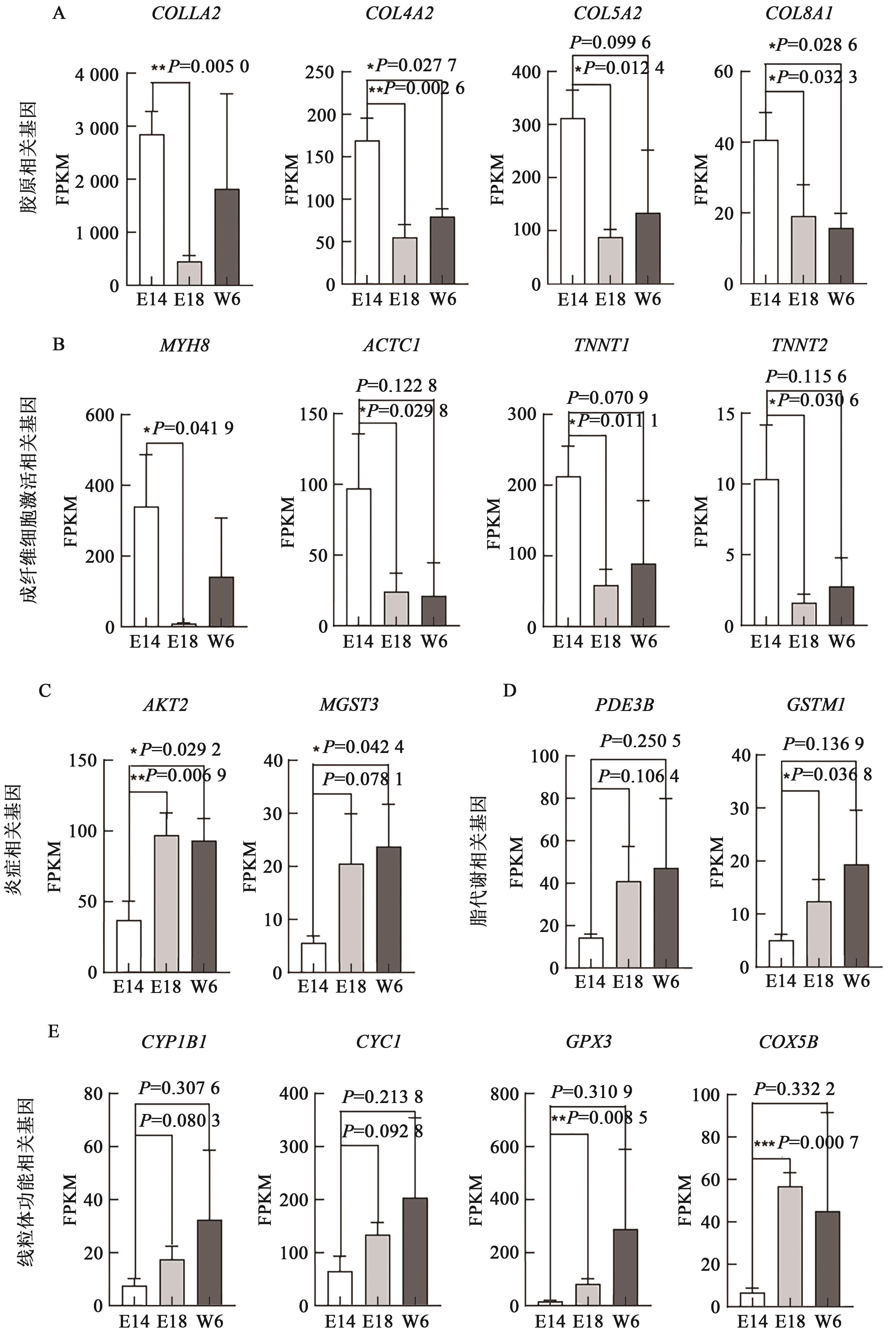 已有研究显示,胎龄小于14 d的小鼠胎儿皮肤能够实现无疤痕创伤愈合。深入研究胎儿无疤痕愈合的分子机理,对于伤口护理方法优化与创伤医学的发展至关重要。利用已有数据库进行不同胎龄的小鼠皮肤组织转录组深入挖掘是常用的研究方法之一。从基因表达综合数据库(gene expression omnibus,GEO)在线数据库中寻找适合无疤痕愈合研究的基因表达谱芯片(GSE71619),其中包含胎龄14 d(E14)、胎龄18 d(E18)和6周龄成年鼠(W6)的皮肤组织样本。分别将无疤痕愈合(E14)与疤痕愈合皮肤组(E18+W6)对比分析,筛选差异表达基因(differential genes,DEGs),获得了4 654个DEGs(|log2 FC|≥1,P<0.05)。通过维恩图分析和基因功能注释确定了228个候选基因,并分为4个不同的Cluster。进一步重点分析了Cluster 3中涉及的基因:对于E14组,上调基因主要与促进伤口愈合的组织重塑和细胞外基质(extracellular matrix,ECM)形成功能相关。通过蛋白互作网络分析,确定了17个属于胶原家族和成纤维细胞迁移相关基因的关键基因。研究结果揭示了ECM的重塑和成纤维细胞活化在早期妊娠胎儿无疤痕愈合模式中的重要性,并筛选出可能的关键基因,为无疤痕伤口护理和创伤、医美领域提供了重要实验依据。