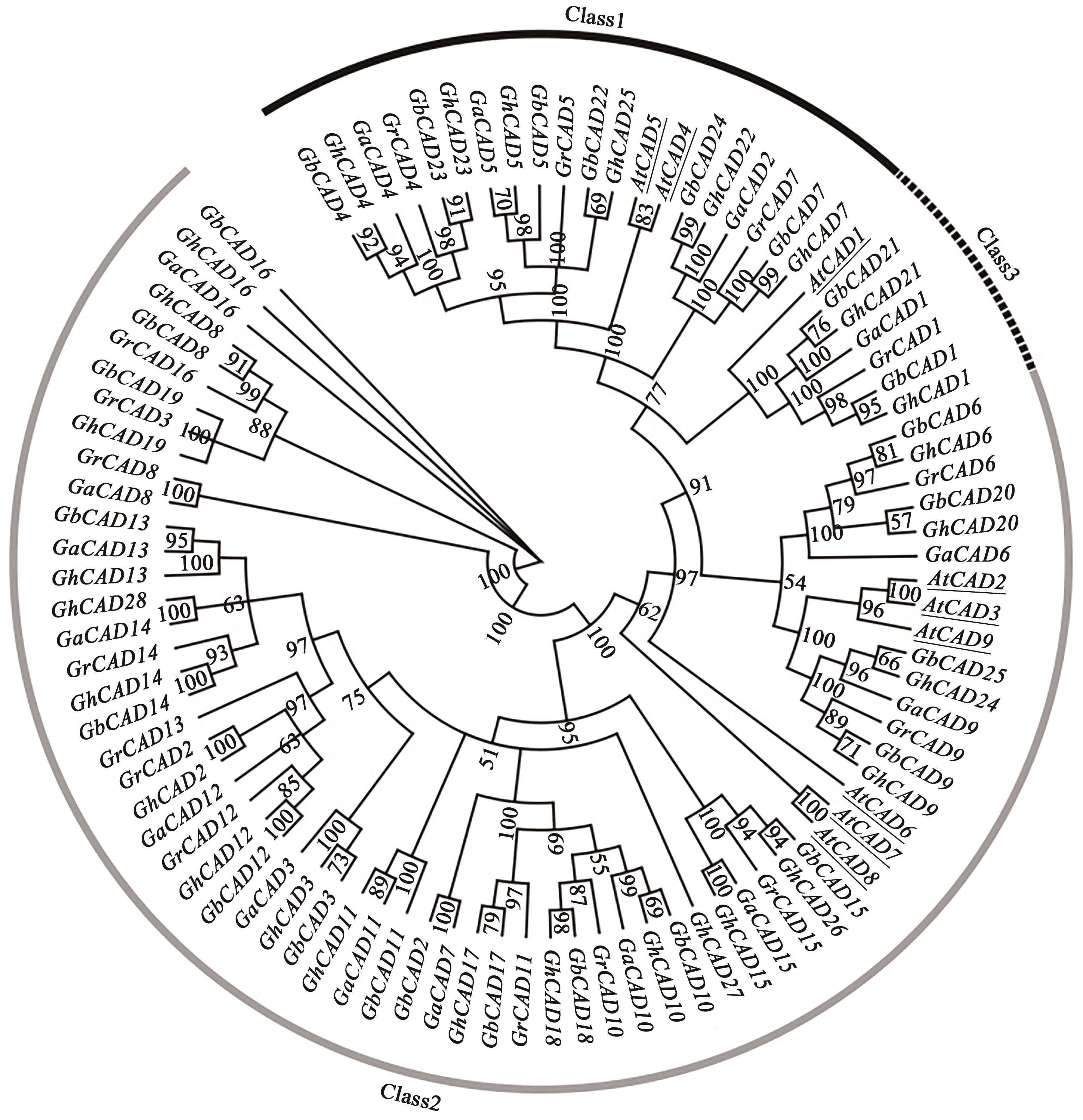 图3 棉花与拟南芥CAD基因家族的系统进化分析注:Class 1—棉花CAD基因组和拟南芥AtCAD4、AtCAD5聚为第1个亚类;Class 2—棉花CAD基因组和拟南芥AtCAD6、AtCAD7、AtCAD8聚为第2个亚类;Class 3—棉花CAD基因组和拟南芥AtCAD2、AtCAD3、AtCAD9聚为第3个亚类。带下划线表示拟南芥CAD基因。