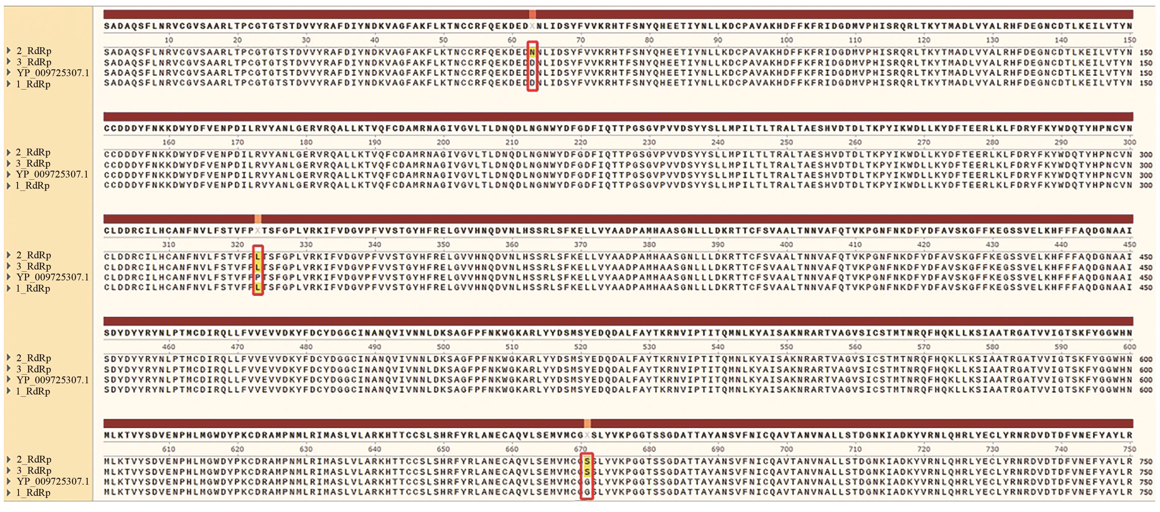 Fig. 1 MSA of amino acid sequences among three classes of Omicron RdRp and the protype SARS-CoV-2 RdRp