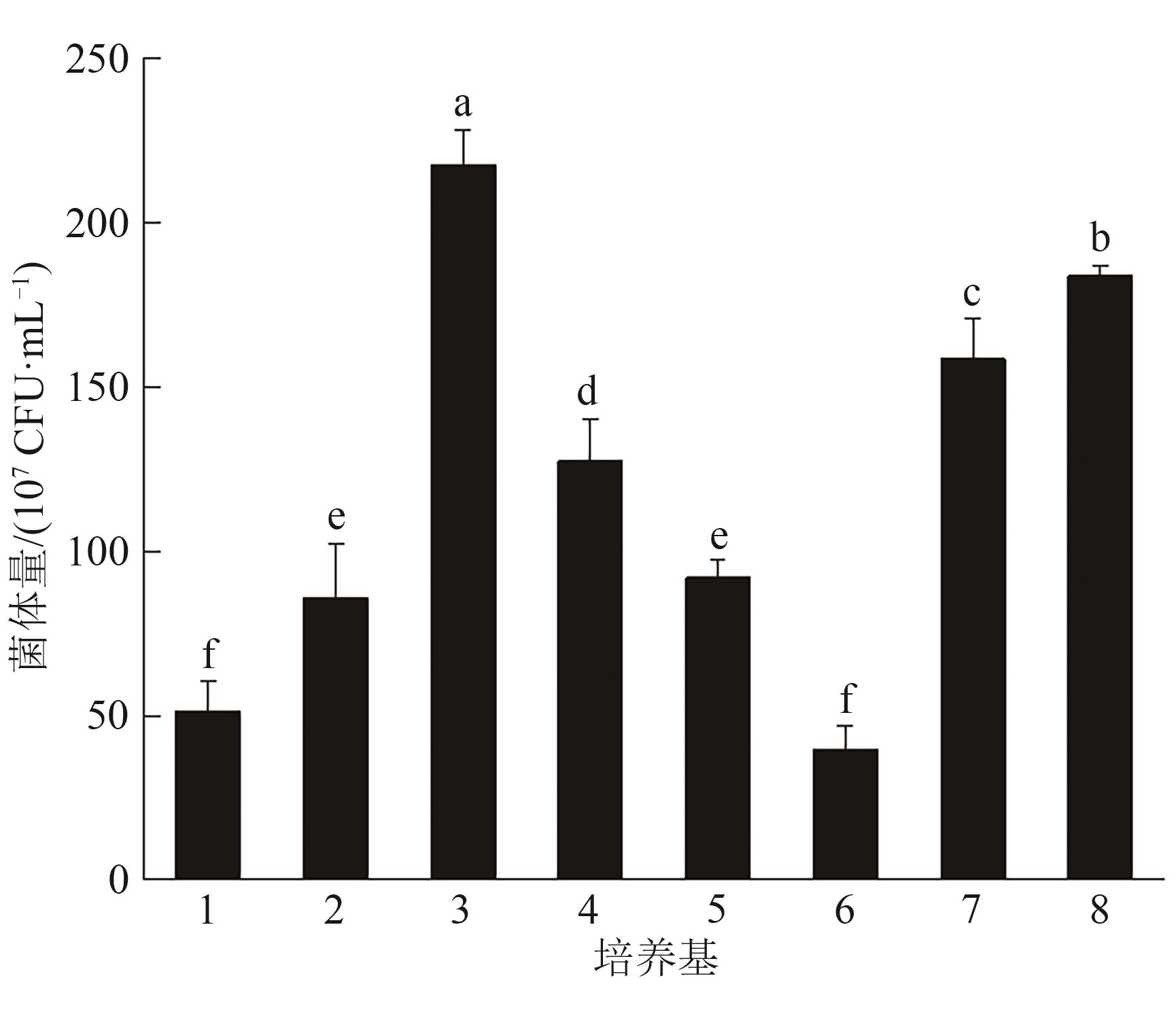 图1 不同基础培养基对贝莱斯芽孢杆菌SD23LJ1314菌株菌体量的影响注:图中培养基序号所对应培养基同表1,不同小写字母表示在P<0.05水平上具有统计学意义。