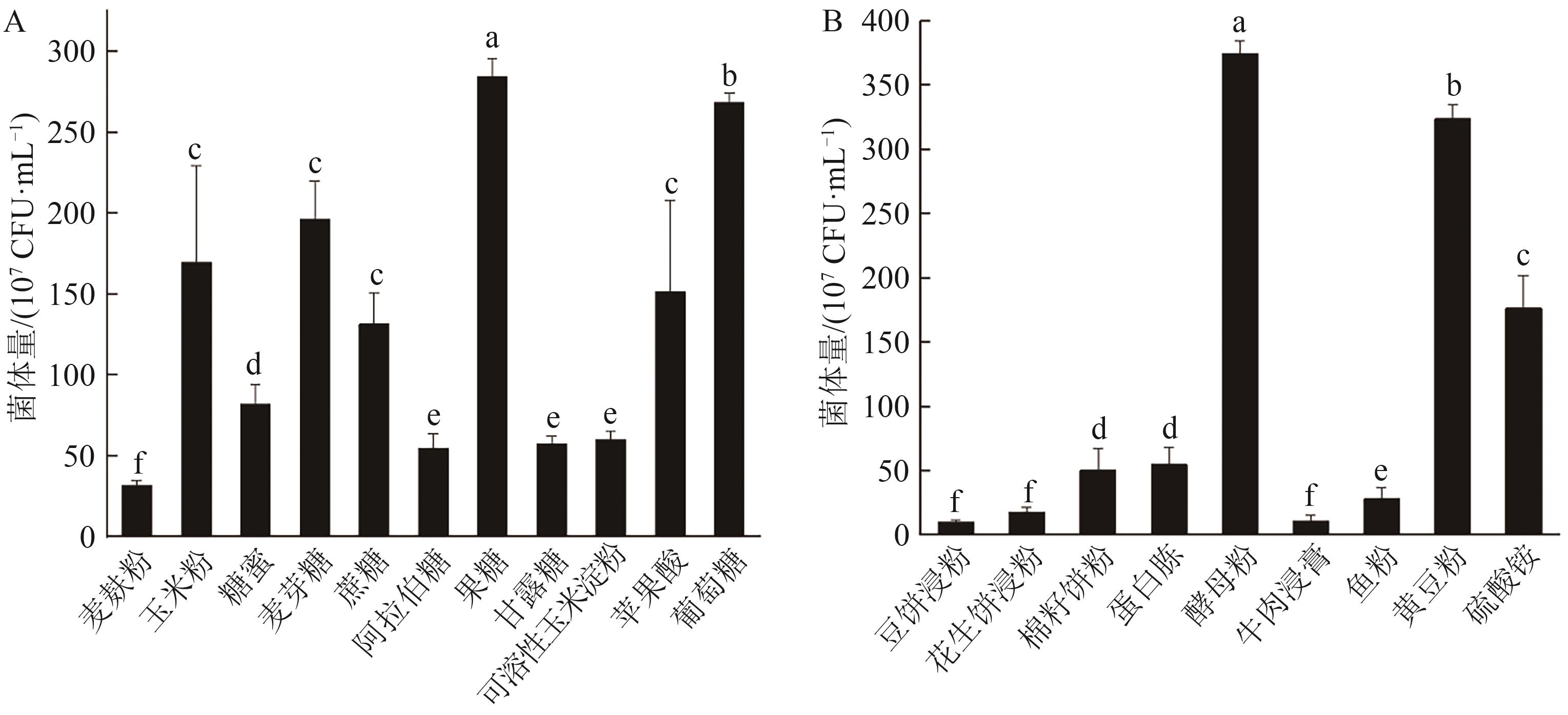 图2 不同碳源和氮源对贝莱斯芽孢杆菌SD23LJ1314菌体量的影响A:不同碳源对菌体量的影响;B:不同氮源对菌体量的影响。图中不同小写字母表示在P<0.05水平上具有统计学意义。