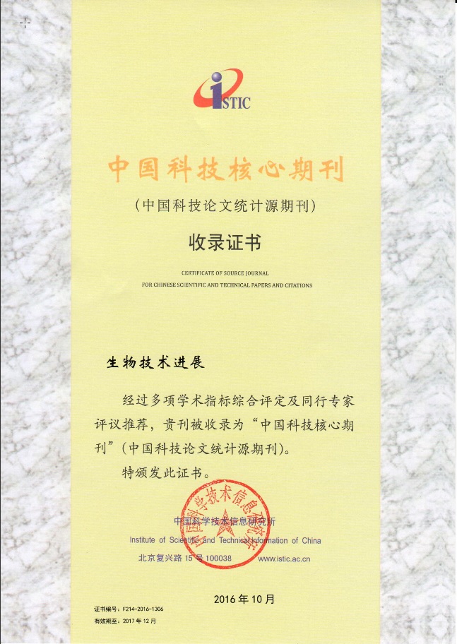 近日,科技部中国科学技术信息研究所正式发布了《2016年版中国科技期刊印证报告(核心板)》,《生物技术进展》经多项学术指标综合评定及同行专家评议推荐,再次成功入选“中国科技核心期刊,至今已连续两次入选“中国科技核心期刊”。
